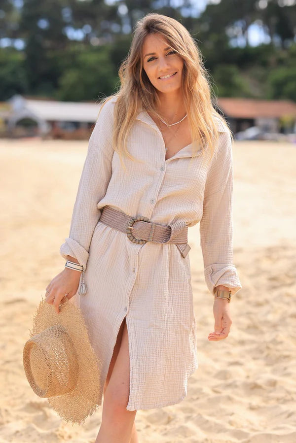 Beige crinkle cotton gauze dress with mother of pearl buttons