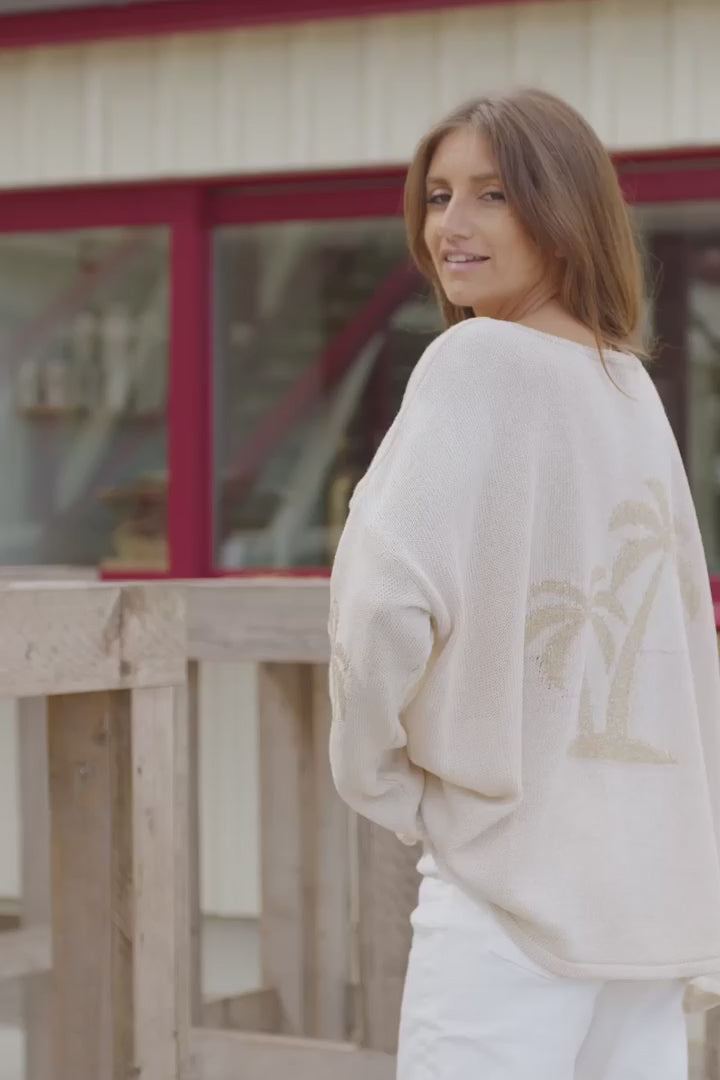 - Warm up on deck or at the shore in our Beige Intarsia Knit Gold Palm Sweater.