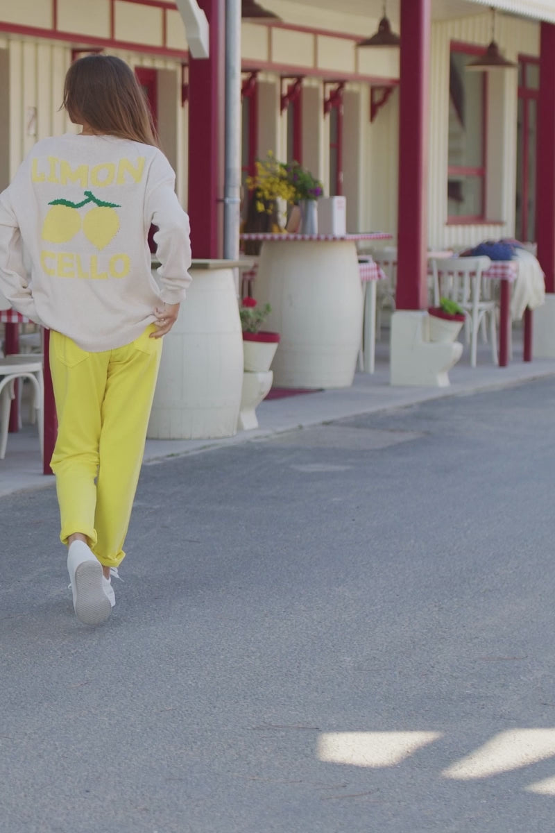 - Small intarsia “Limoncello” letting and lemon motif on front and large motif on back.