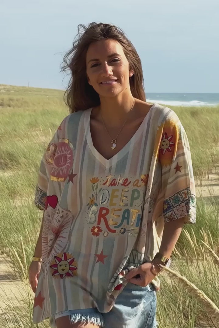 - Multicolor vertical stripes and whimsical “Take a Deep Breath” motif on front, sun, hearts and stars on back.