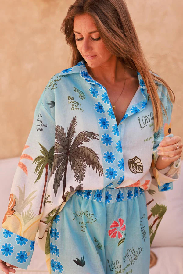 - Blue tropical escape floral, script, palm and leaf multi print with blue flower trim.