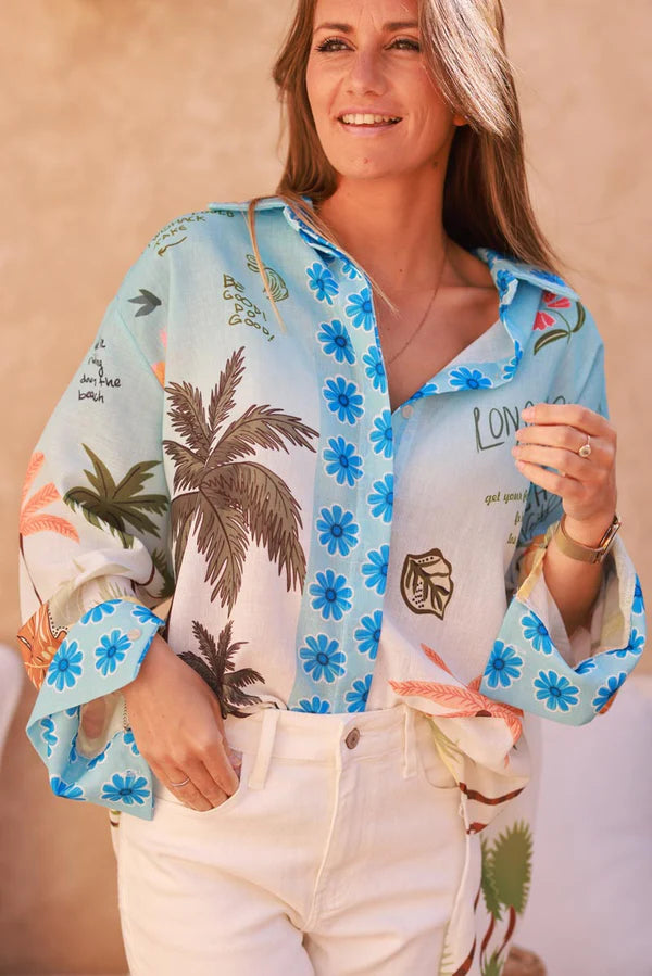 - Make your next getaway a stylish affair in our Blue Floral Tropical Escape Print Blouse.
