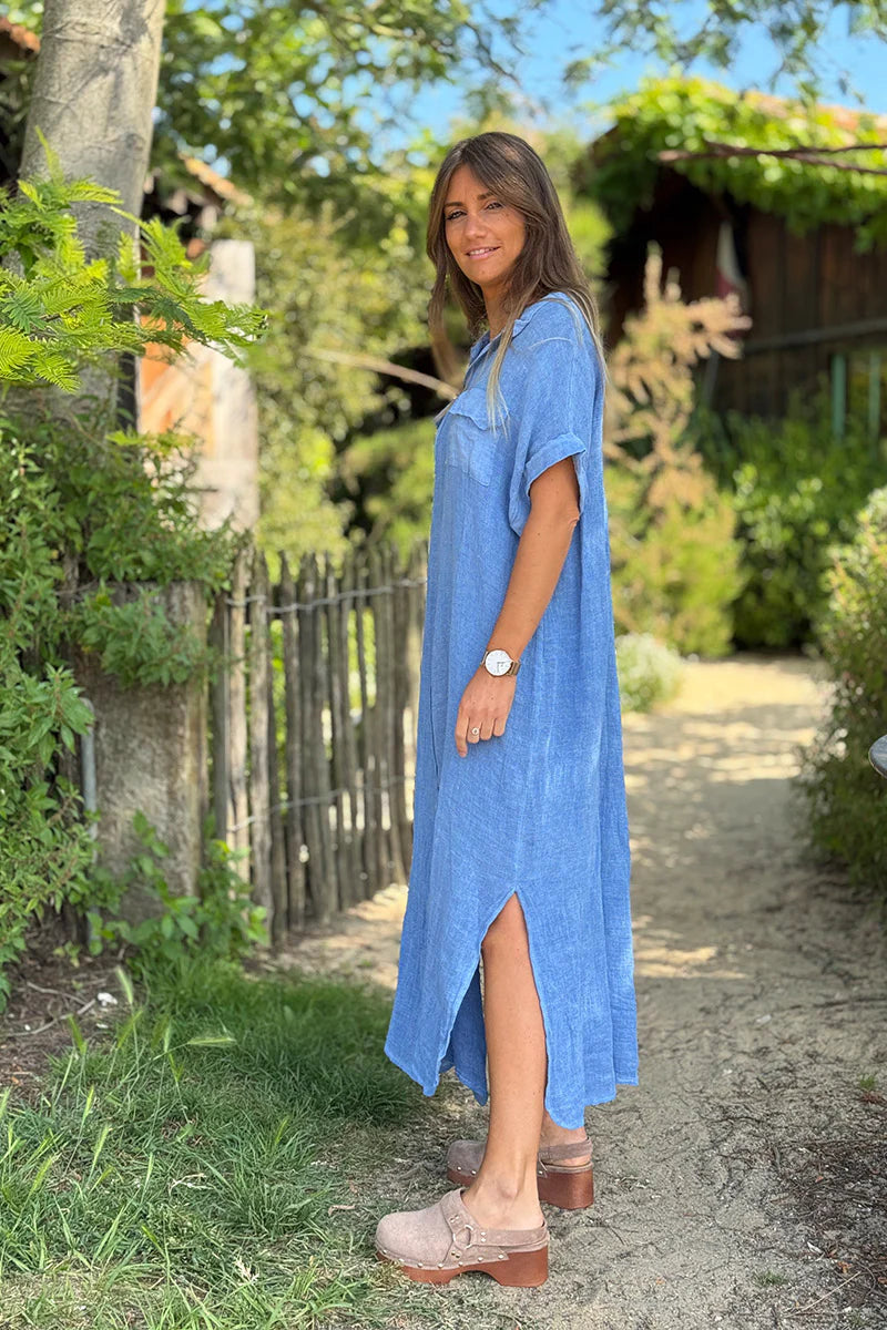- Luxury and loungewear go hand-in-hand in our Blue Linen Beach Maxi Dress.
