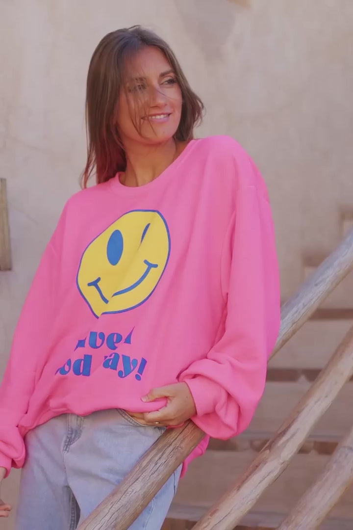 - Pair this Flash Pink smiley face sweater with your favorite wide-leg jeans or cutoff denim and make any day a little bit brighter.