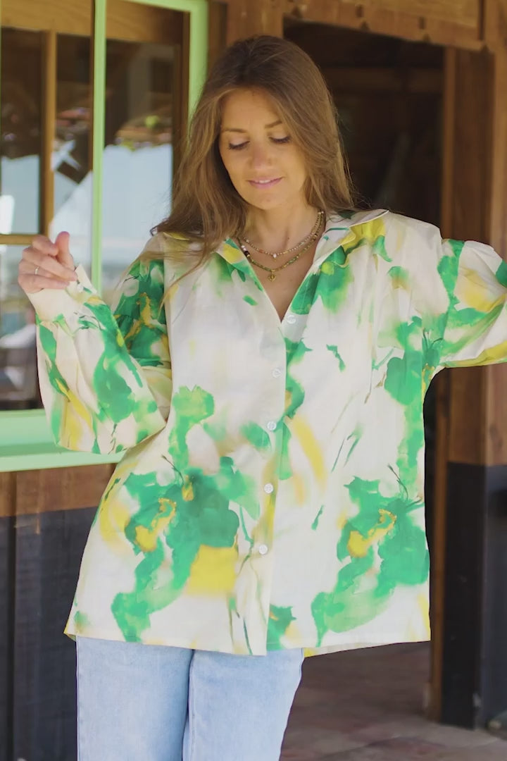 - Elevate your love of free-spirited styles with our Green Tie-Dye Button-Down Blouse.