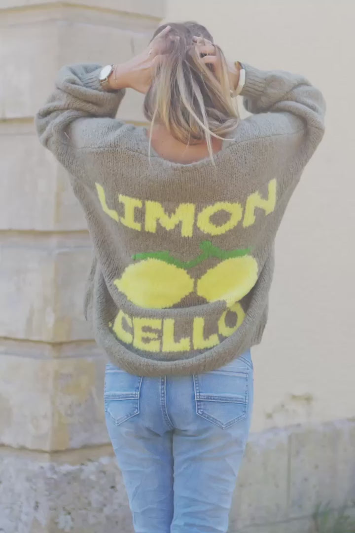 - Olive chunky knit cardigan with a yellow green lemon and 'limoncello' back pattern.
