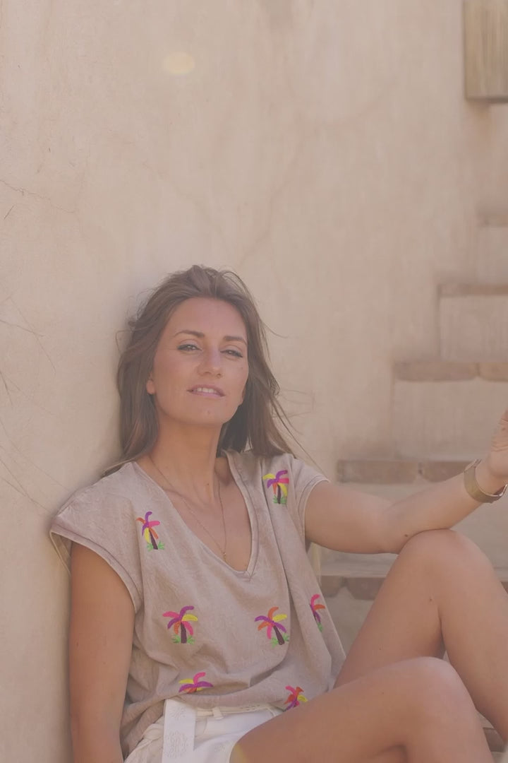- Give your casual ensembles a tropical flair in our Light Brown Embroidered Palms Cap-Sleeve Cotton Tee.