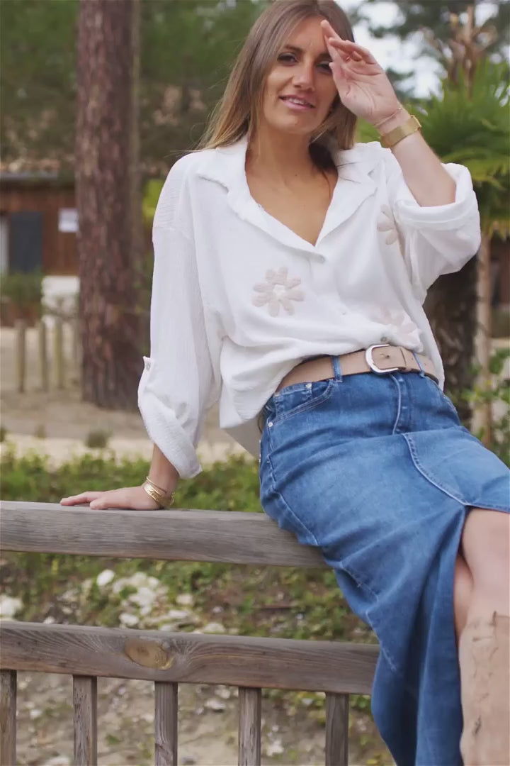 – The skirt has a slit at the front with 5 pockets and a zip and button fastening.