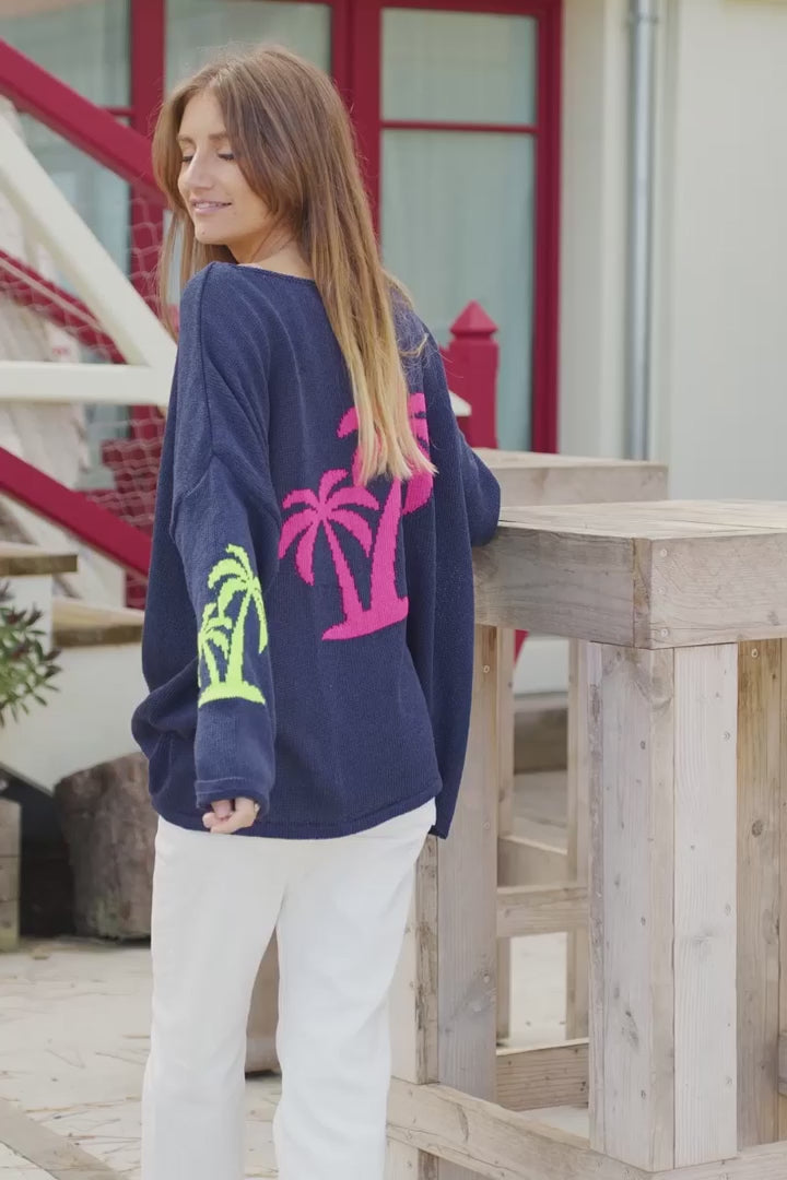 - Warm up on deck or at the shore in our Navy Intarsia Knit Coral Palm Sweater.