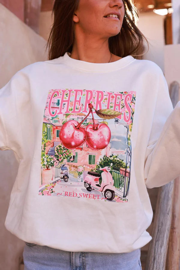 - Escape from the ordinary in our juicy sweet Off White Cherry Vacation Sweater.