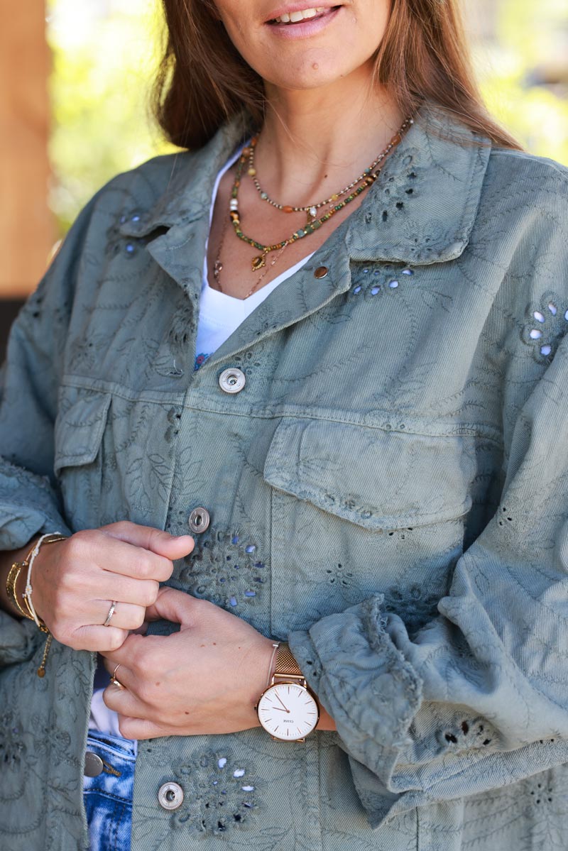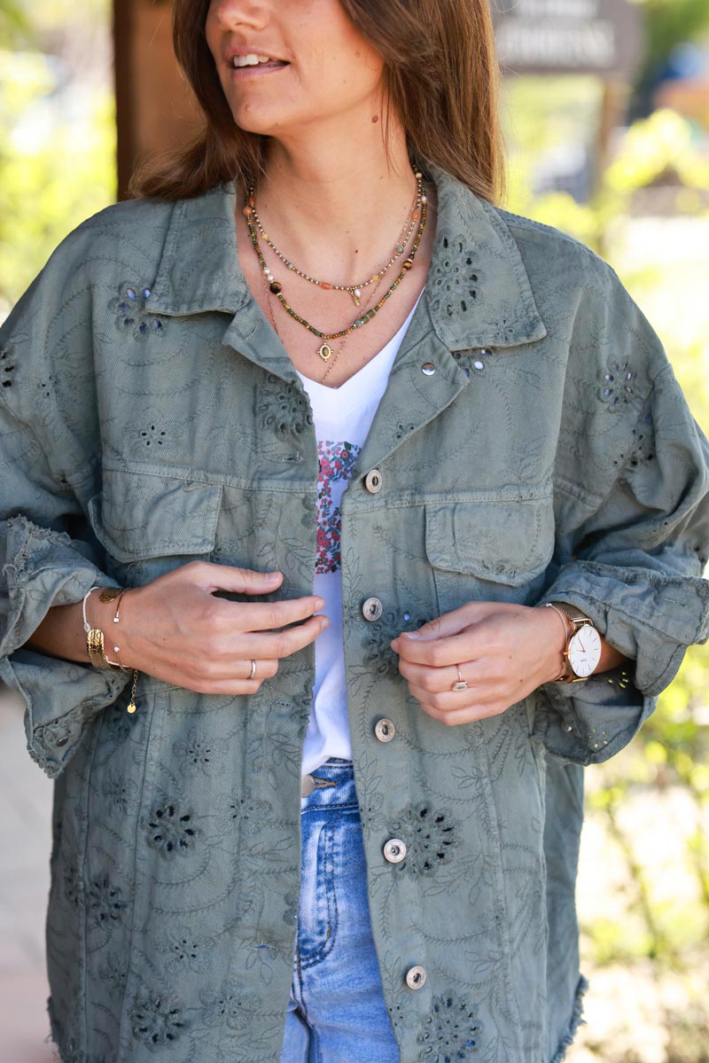 - Feminine and utilitarian styles collide in our Olive Eyelet Motif Utility Jacket.