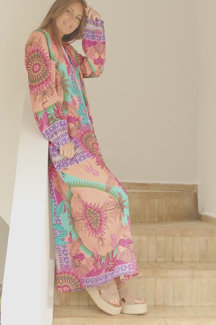 Orange Jungle Leaf Tribal Button-Down Maxi Dress