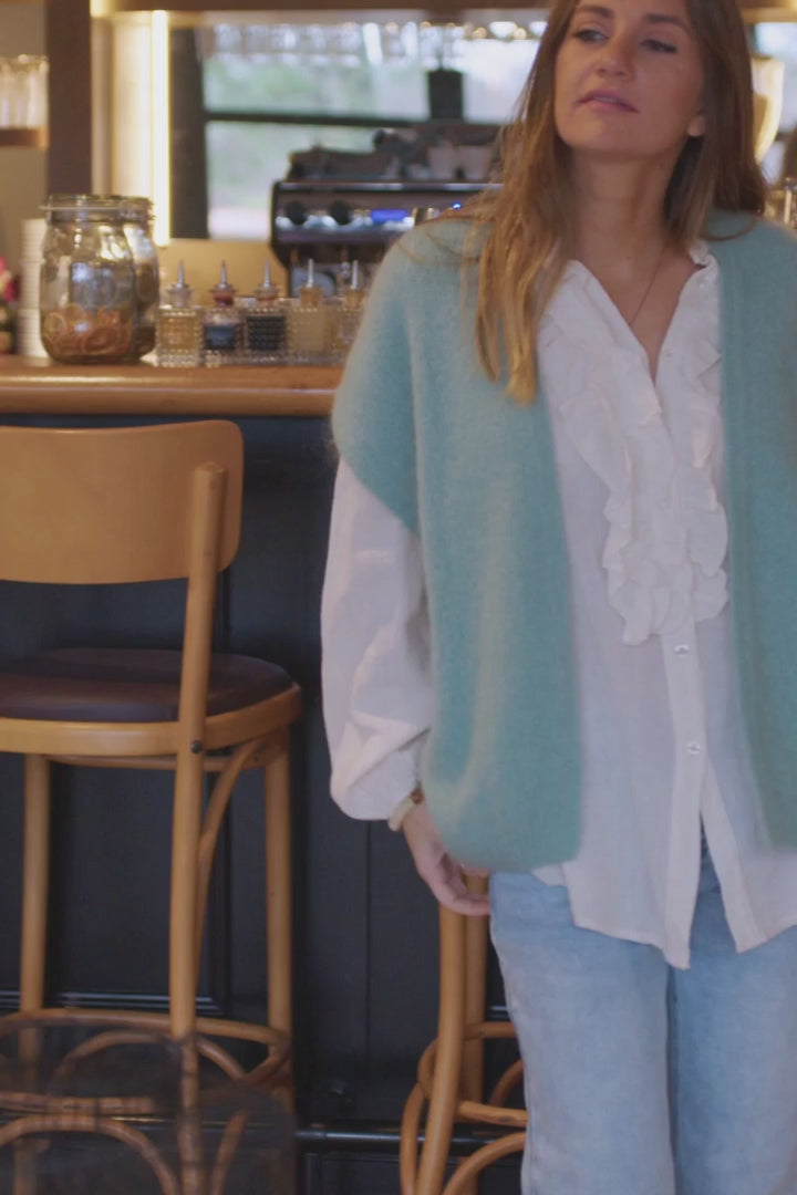 - This loose water green chunky knit sleeveless vest is the perfect piece to finish off your outfits with style and simplicity.
