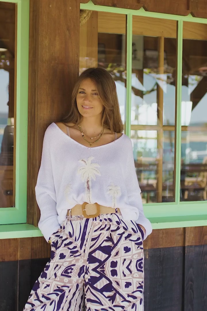 - Tropical elegance is all yours in our White Textured Palm Slouchy Knit Sweater.