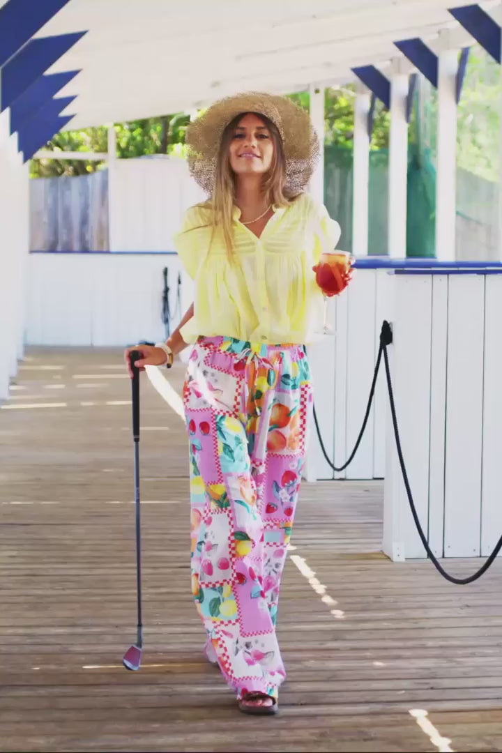 - Wide leg floaty colorful pants with summer fruit print, ideal for a girly pop and comfortable look.